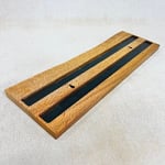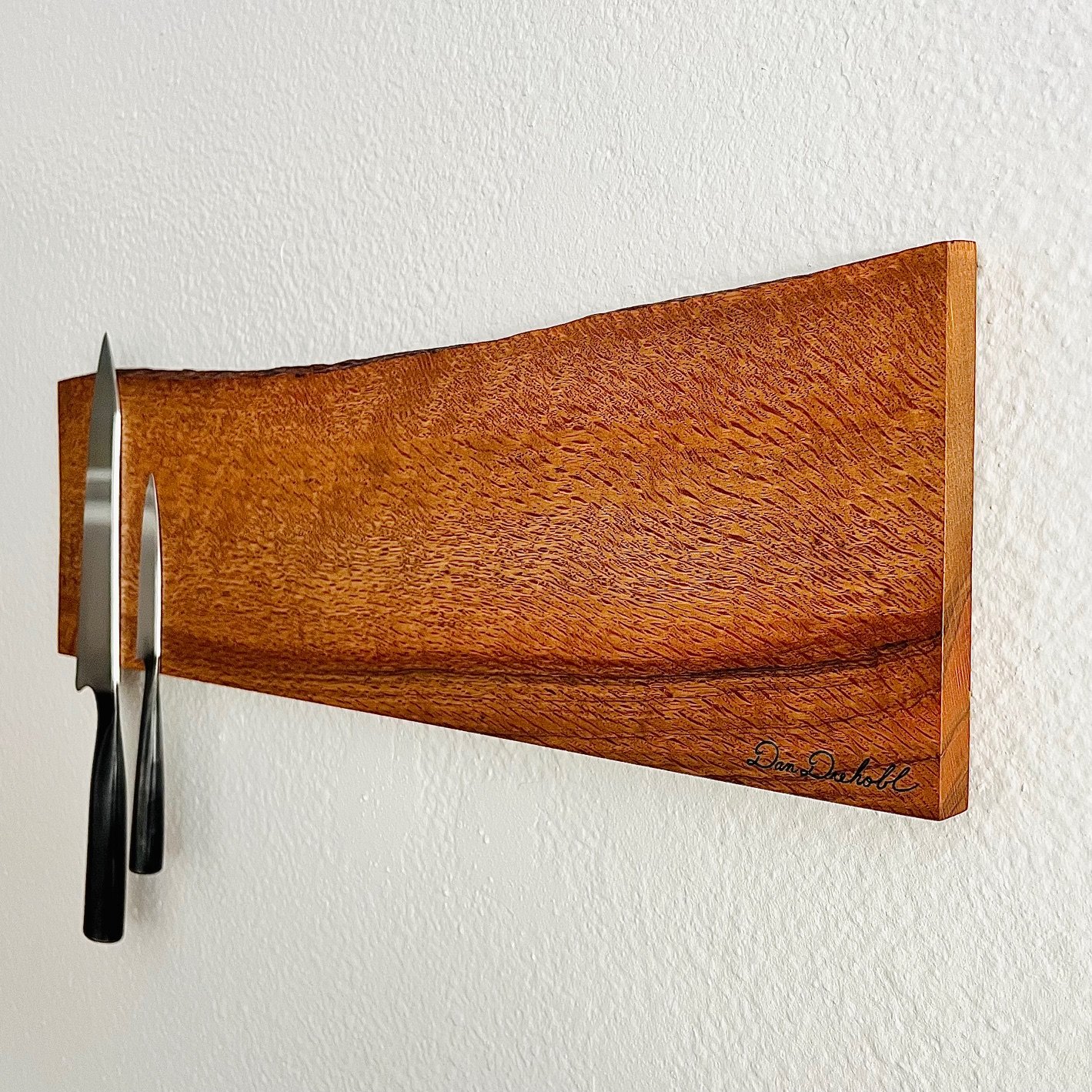 3/4" x 21 1/4" x 7" Hand made from live oak. Features two strips of magnets for maximum knife hold. Finished with polyurethane, danish, and mineral oils. Has two keyholes on the back for screw hanging.
