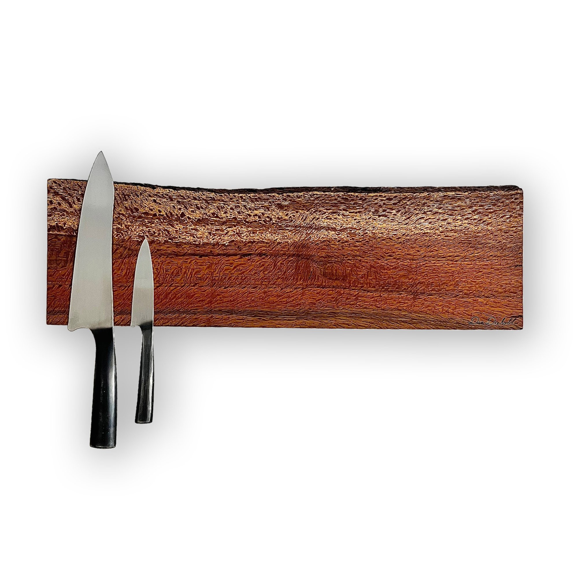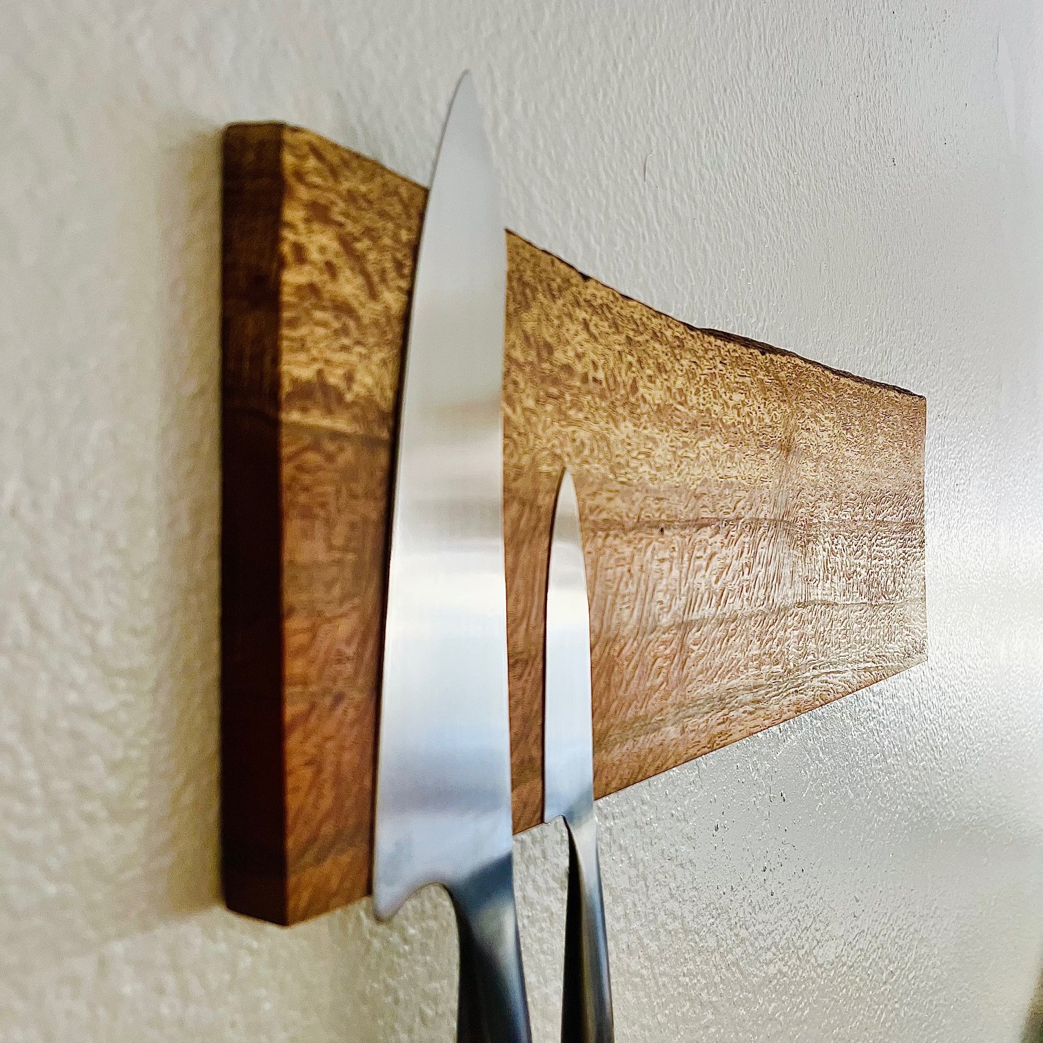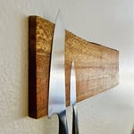 3/4" x 21 1/4" x 6 1/2" Hand made from live oak. Features two strips of magnets for maximum knife hold. Finished with polyurethane, danish, and mineral oils. Has two keyholes on the back for screw hanging.