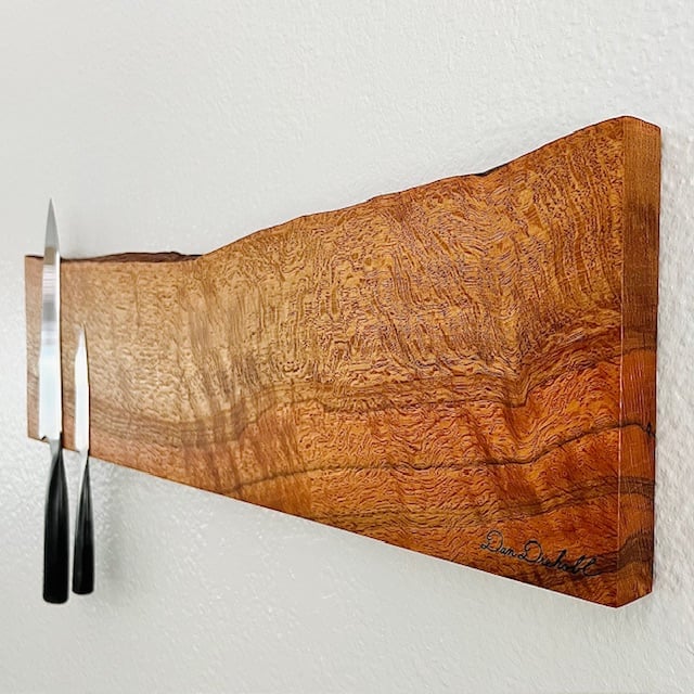 1" x 23 1/2" x 7" Hand made from live oak. Features two strips of magnets for maximum knife hold. Finished with polyurethane, danish, and mineral oils. Has two keyholes on the back for screw hanging.